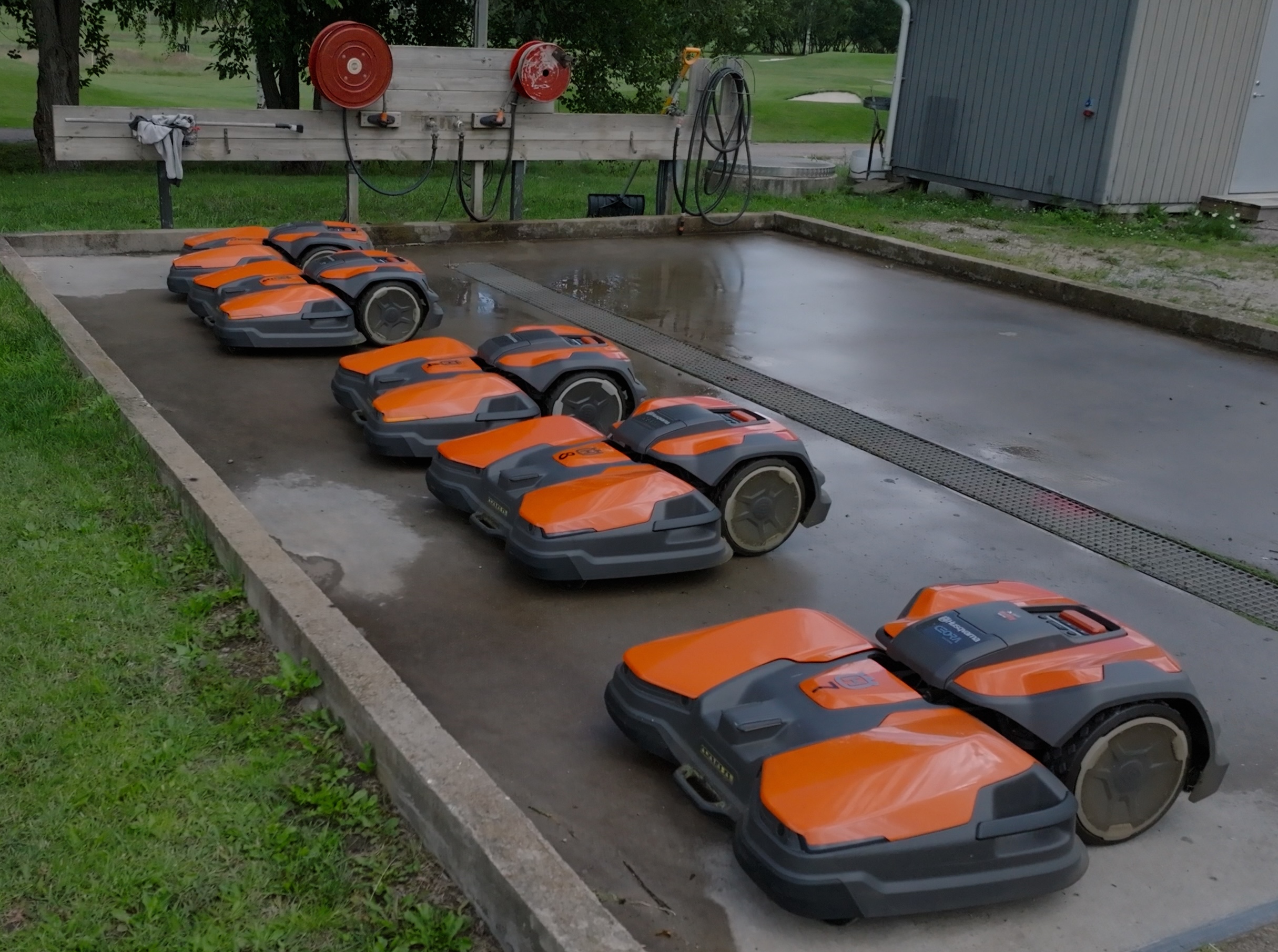 – Vi får dem att ”gå hem”, de är programmerade så, säger Thomas. Alla Ceoror kommer åkande till två olika servicepunkter. Sex till verkstaden och fyra till spolplattan vid klubbhuset där vi brukar tvätta golfbilar.